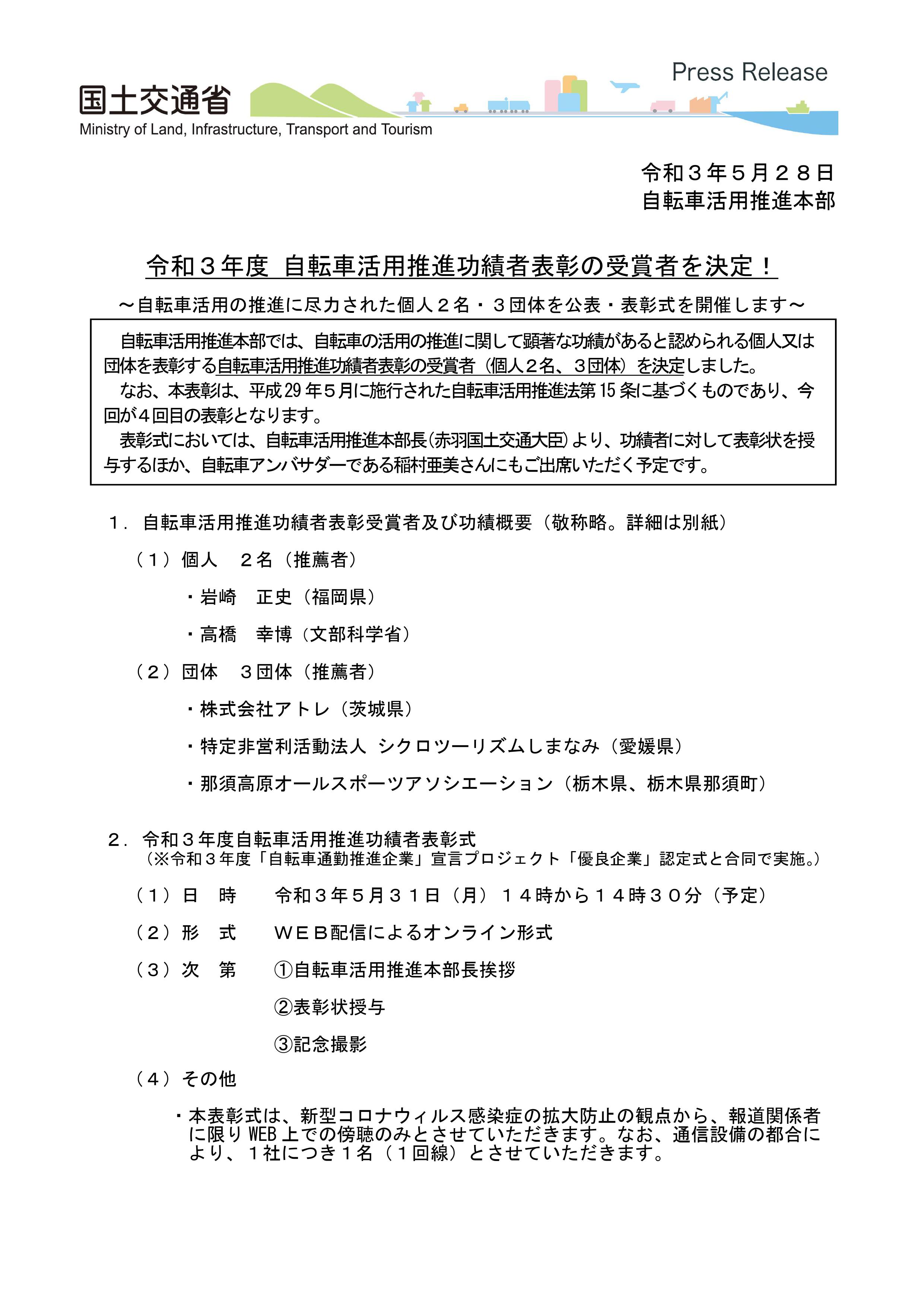 国土交通省自転車活用推進本部より令和3年度自転車活用推進功績者表彰を受賞することになりました!